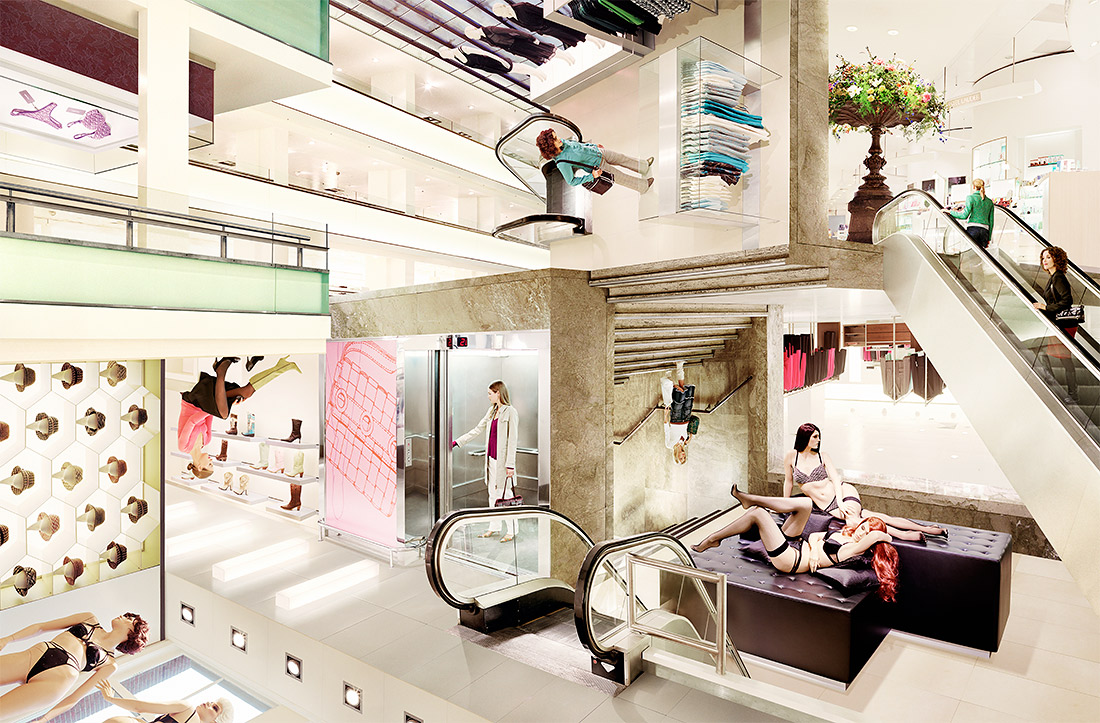 The woman's departement showing sexy lingerie, trendy clothing and jewelry. But also well known cosmetics and delicious perfume.